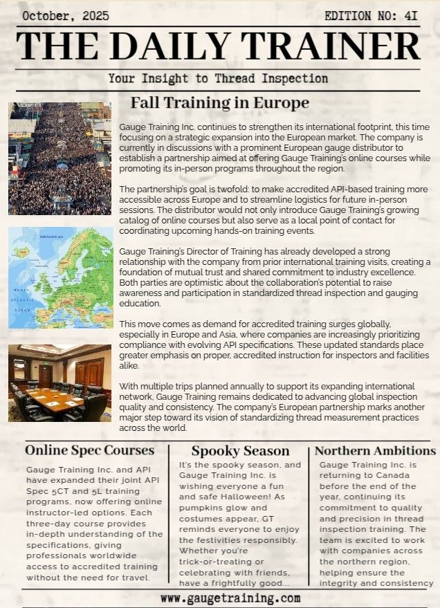 Gauge Training Inc provides up to date, professional training to the strictest API standards in the proper techniques and procedures to measure thread forms for casing, tubing and rotary shouldered connections. With a strong commitment to quality, repeatability and performance, we provide in-person and on-line training programs tailored to the needs of the energy industry worldwide. As a proud API-U licensed provider, Gauge Training Inc is your premium source for precision measurement training and advances technical expertise. With Gauge Training on your side, you can MEASURE WITH CONFIDENCE!